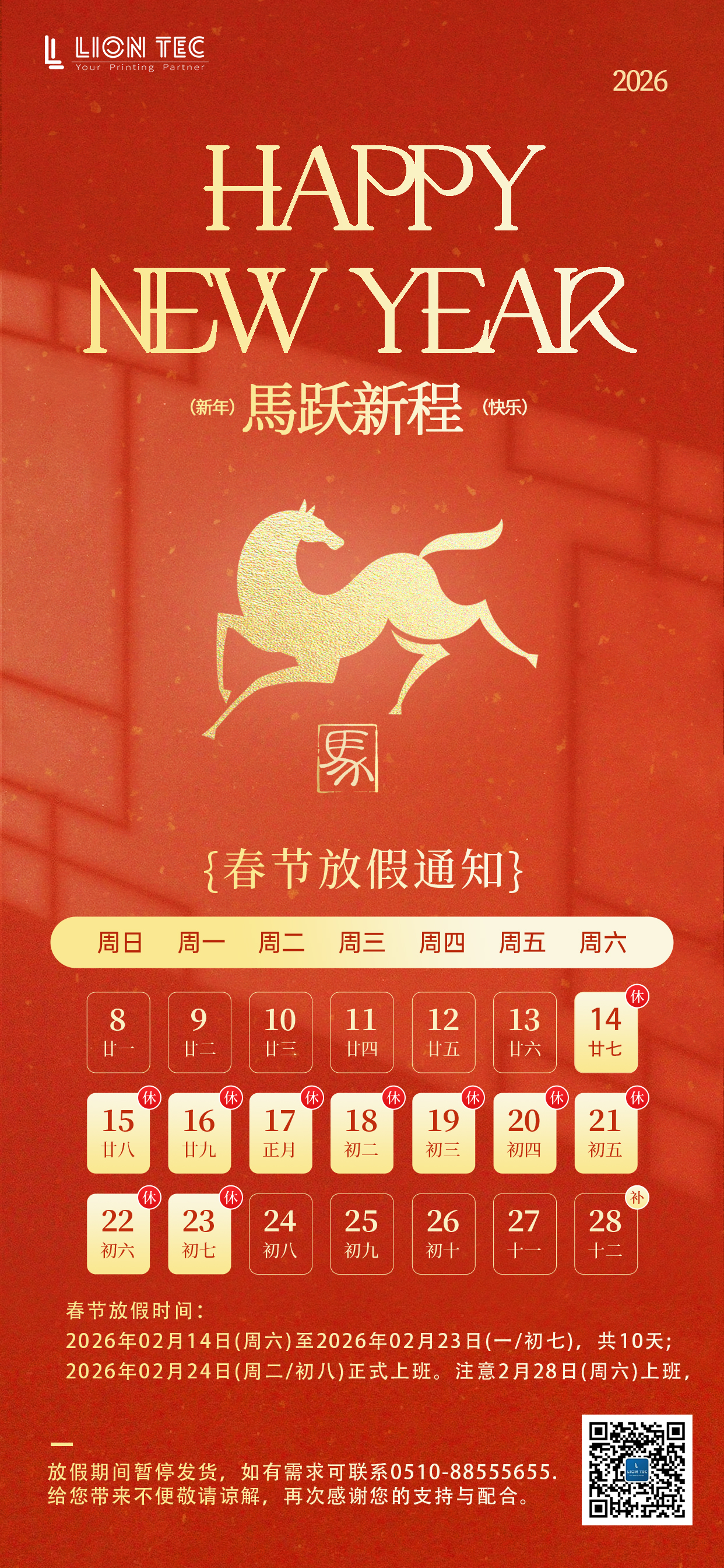 策馬揚(yáng)鞭,共赴新程 | 藍(lán)茵科技致2026馬年春節(jié)放假通知